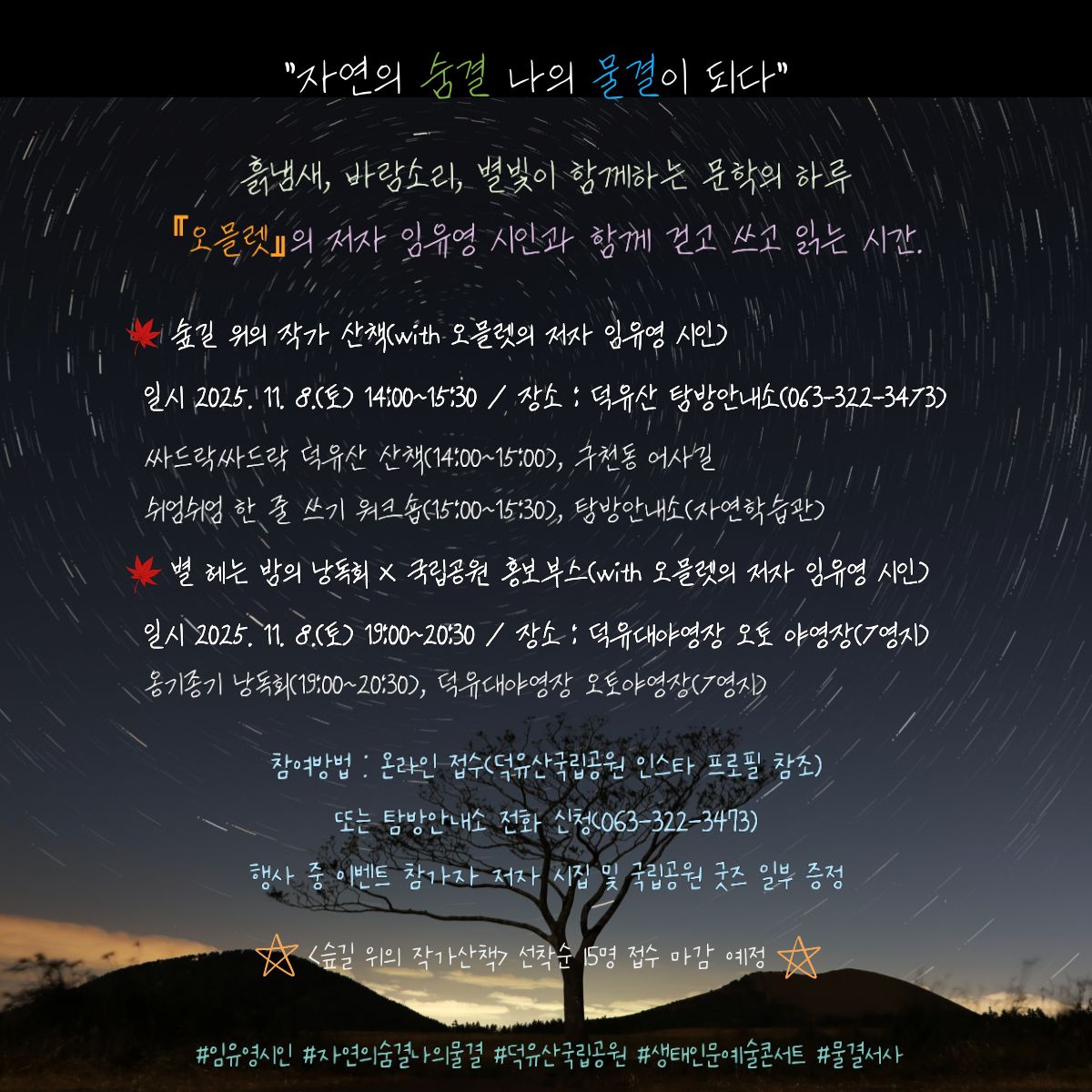 11월 8일(토) 14시부터 '국립공원 작가 산책'과 같은 날 19시에는 덕유대야영장 오토야영장에서