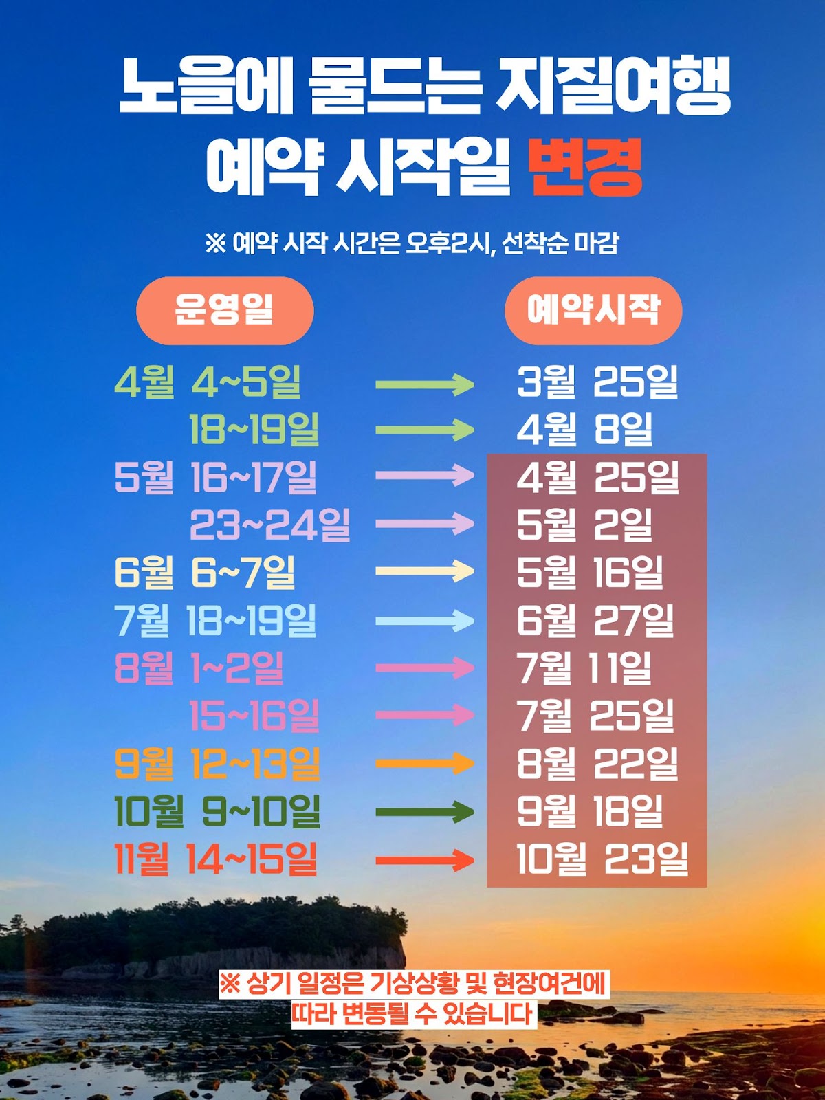 안녕하세요. 변산반도생태탐방원입니다. 2026년에 운영 중인 '노을에 물드는 지질여행' 예약 시작일이 변경되었습니다.